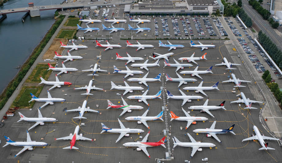 Dozens of new Boeing 737 MAX airplanes sit idle in a lot adjacent to Boeing Field. The fleet has been grounded by aviation agencies since March 2019. Photo by Stephen Brashear/Getty Images